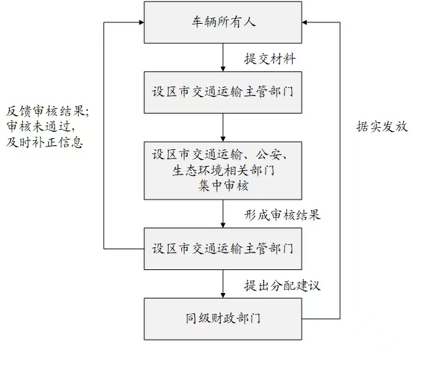 设区市交通运输主管部门在收到申请信息后,应及时会同公安、生态环境等部门按照职责分工对照政策要求进行集中会审,形成审核意见留档备查(各市可根据实际情况进行调整),并在受理申请后10个工作日内完成审核,将审核结果及时反馈申请人。为加快工作进度,各地在前期审核工作中,相关部门对申报材料可先盖部门章(业务章),后续定期统一在《申请表》上加盖市交通运输局、市财政局公章。