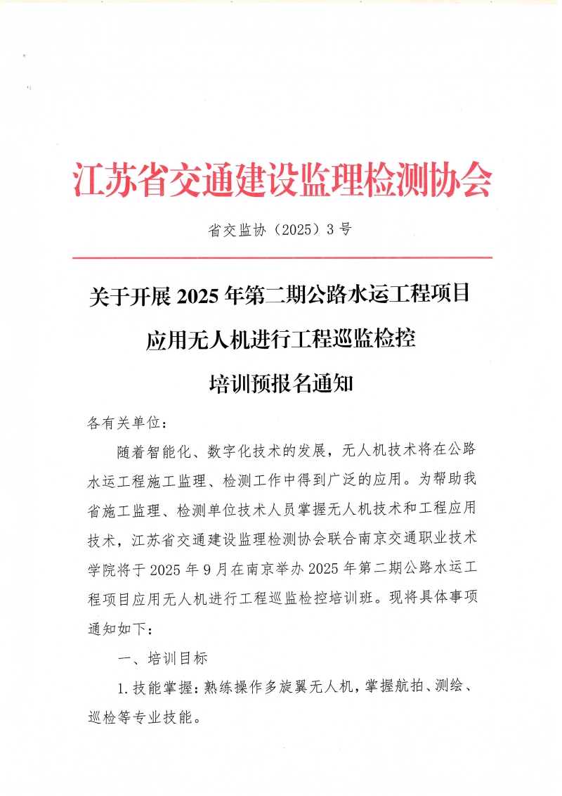 江苏省交通运输厅门户网站 协会动态 关于开展2025年第二期公路水运工程项目应用无人机进行工程巡监检控培训预报名通知-安博app官方网站